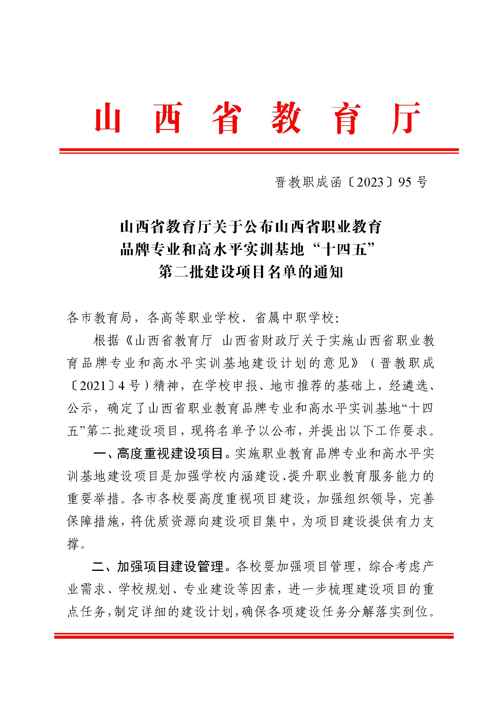 近日,山西省教育廳公布山西省職業(yè)教育品牌專業(yè)和高水平實(shí)訓(xùn)基地“十四五”第二批建設(shè)項(xiàng)目名單的通知,高職學(xué)校38所,中職學(xué)校71所,10個(gè)自籌項(xiàng)目。